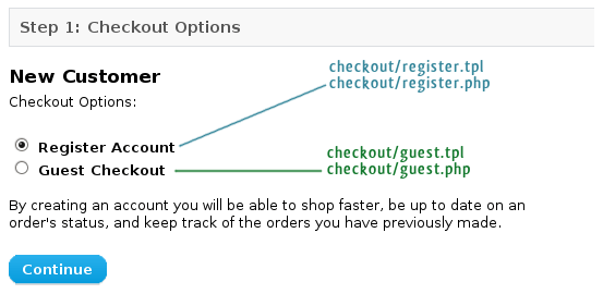 Mai întâi, să copiem șablonul original: catalog / view / theme / default / template / checkout / register.tpl în catalog / view / theme / default / template / checkout / register-new.tpl .