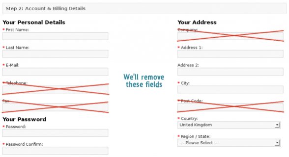 Cea mai ușoară metodă este să ascundeți câmpurile de intrare și să eliminați verificările de eroare. Voi folosi OpenCart 1.5.1.3 ca bază, dar acest lucru ar trebui să fie similar pentru toate versiunile 1.5.x. Vă recomandăm să modificați fișierele OpenCart numai prin vQmod sau OCMOD.